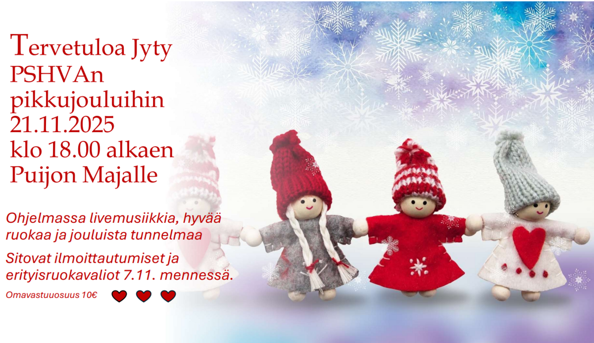 Pikkujoulujen omavastuuosuus on 10 € (maksuohjeet saat sähköpostitse ilmoittautumisen jälkeen)